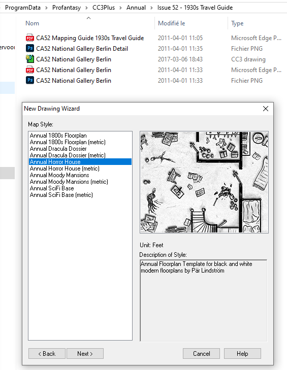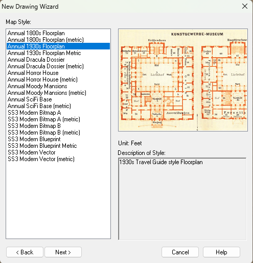 I'm trying to create a floorplan using the 2011 annual 1930's travel guide. I follow the PDF but blocks on the 1st step as the floorplan map style is not listed (there are a few others). I have a bunch of annuals, and oddly enoough I can open Berlin National Cartography FCW file.