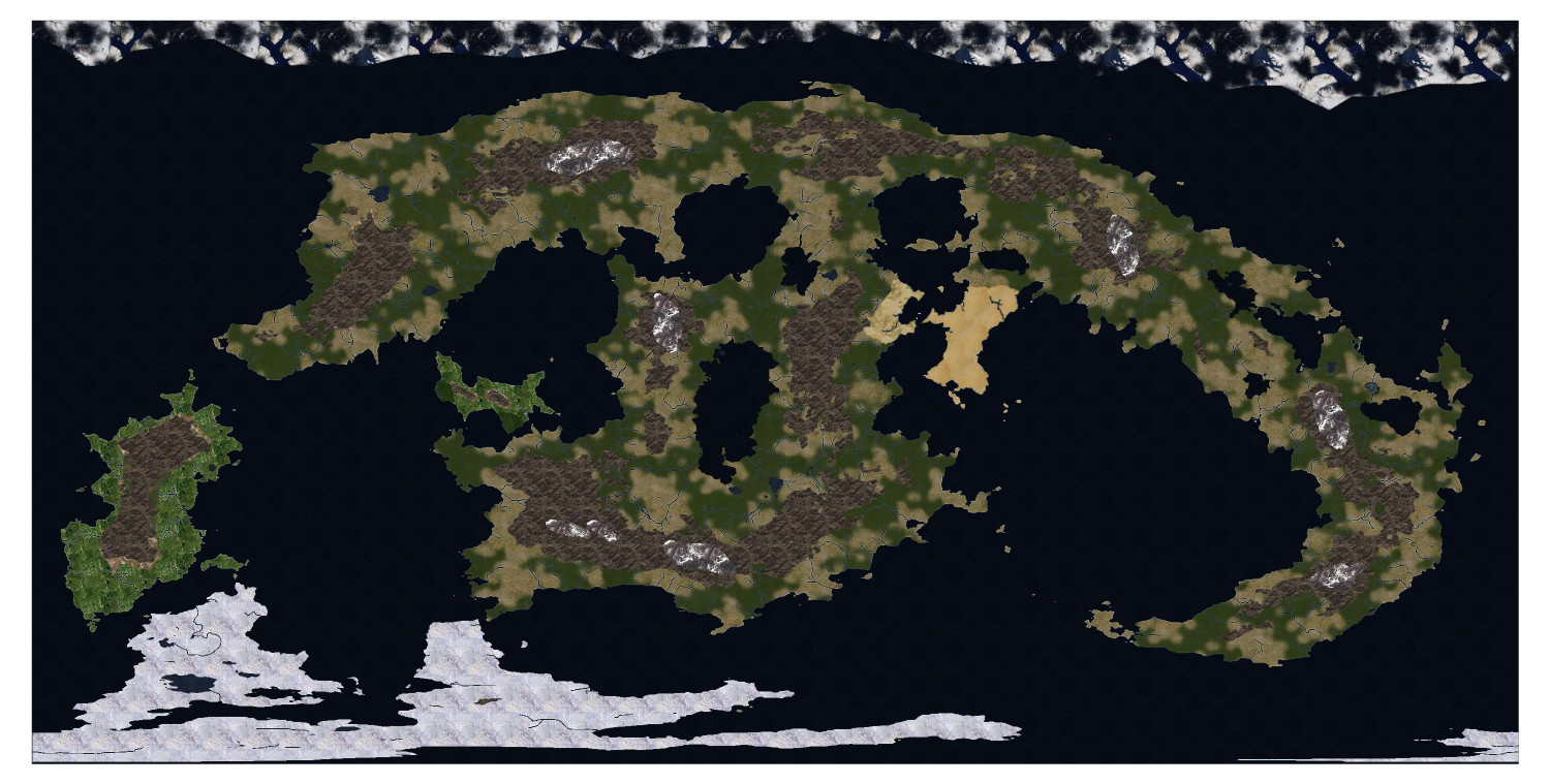 Inspired by the most recent Live tutorial, here's a quick and dirty rendering of my campaign world in the Cosmographer Satellite annual. Taught myself a few new techniques in the process regarding exploding multipolies so that the land masses brought in from a Fractal Terrains export could be managed separately -- but then I had to rescue the inland seas and lakes.