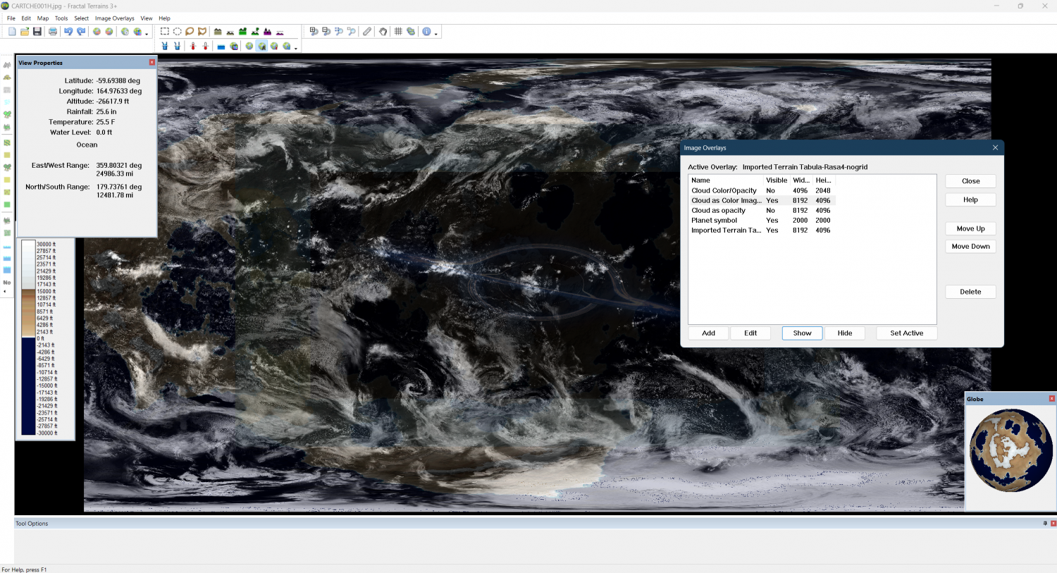 The first image shows my layers stacked up with no cloud layer. The second image show what happens to those layers if I create a layer with a combined cloud color and opacity image, with or without touching the opacity slider. If I create (and display) a layer with JUST the cloud opacity layer, it does nothing, regardless of the opacity slider. If I create and display a layer with just the color layer (and display it), it makes the same mess in the second image.