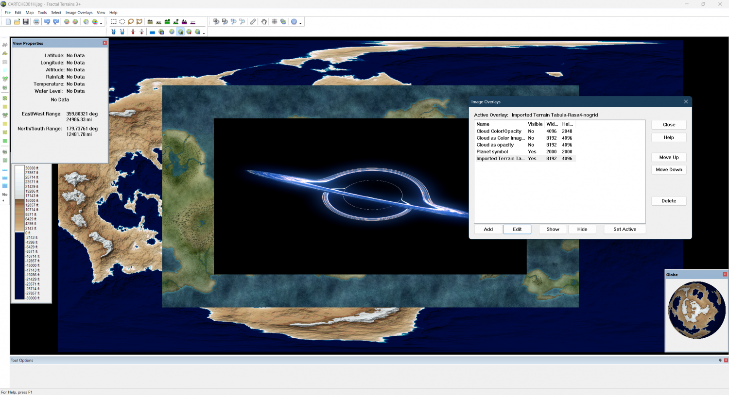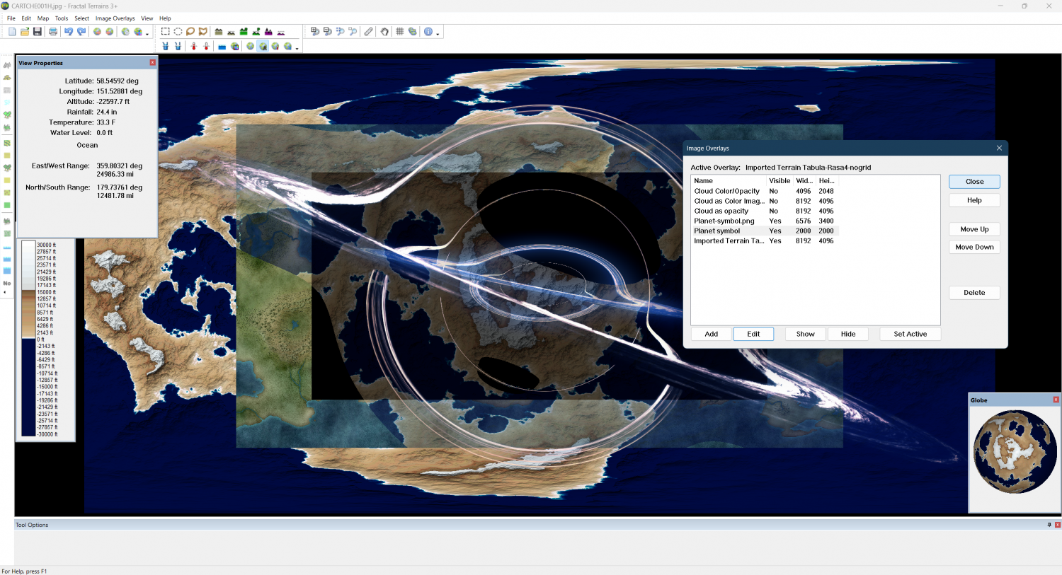I created a transparent version of the planet symbol above, using black as the mask. I then imported the PNG file as the color image in a new layer. Here we can see that the 100% transparent portion of the layer acts as normal, but the semi transparent areas around the rings, cause all of the layers below it to become semi-transparent.
