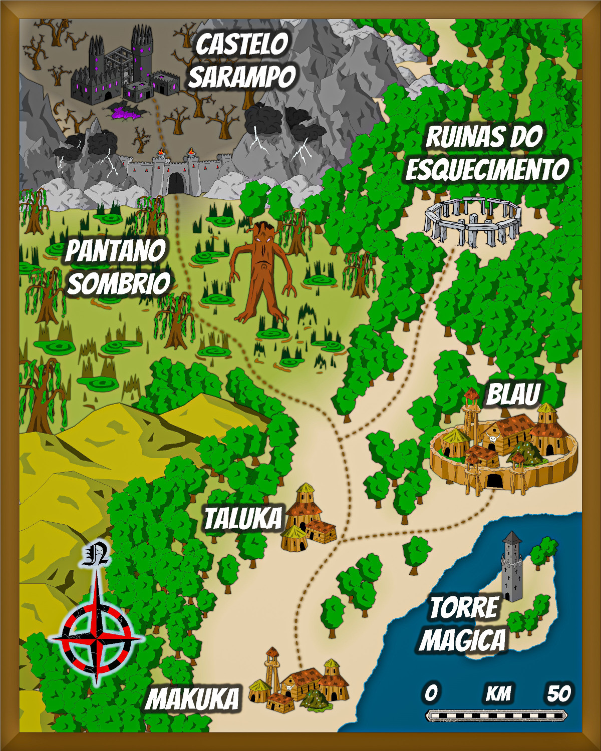 The locations are: Castle Measles, Dark Swamp, Ruins of Oblivion and Magic Tower.