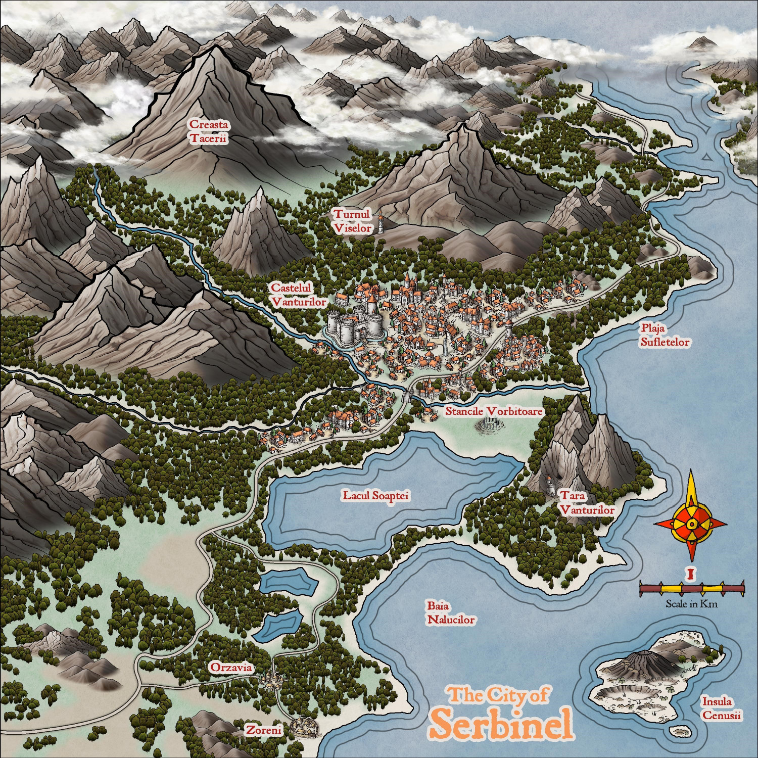 Using Handdraw fantasy as the base of the map, Symbols of structures by Mike Schley and all the lush nature of Sue Richards Darklands to make the city of Serbinel.