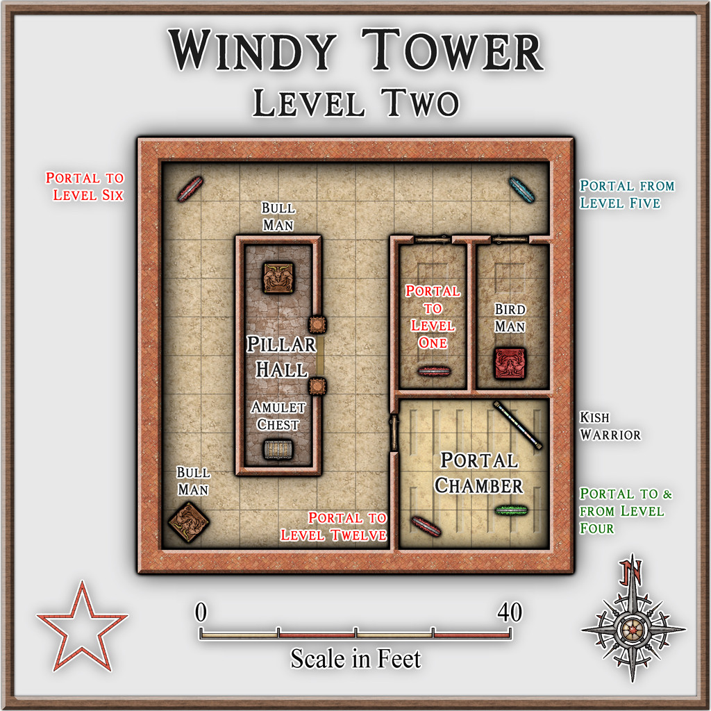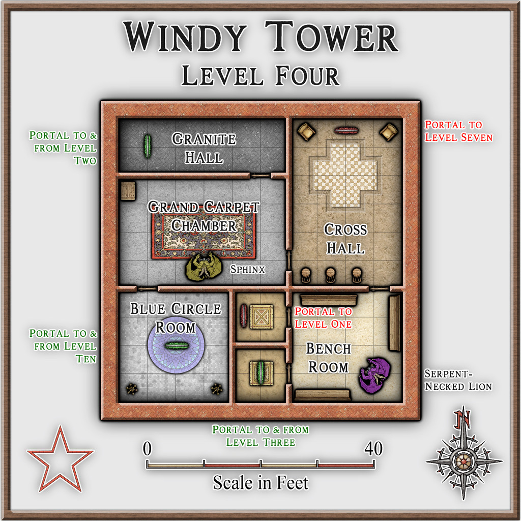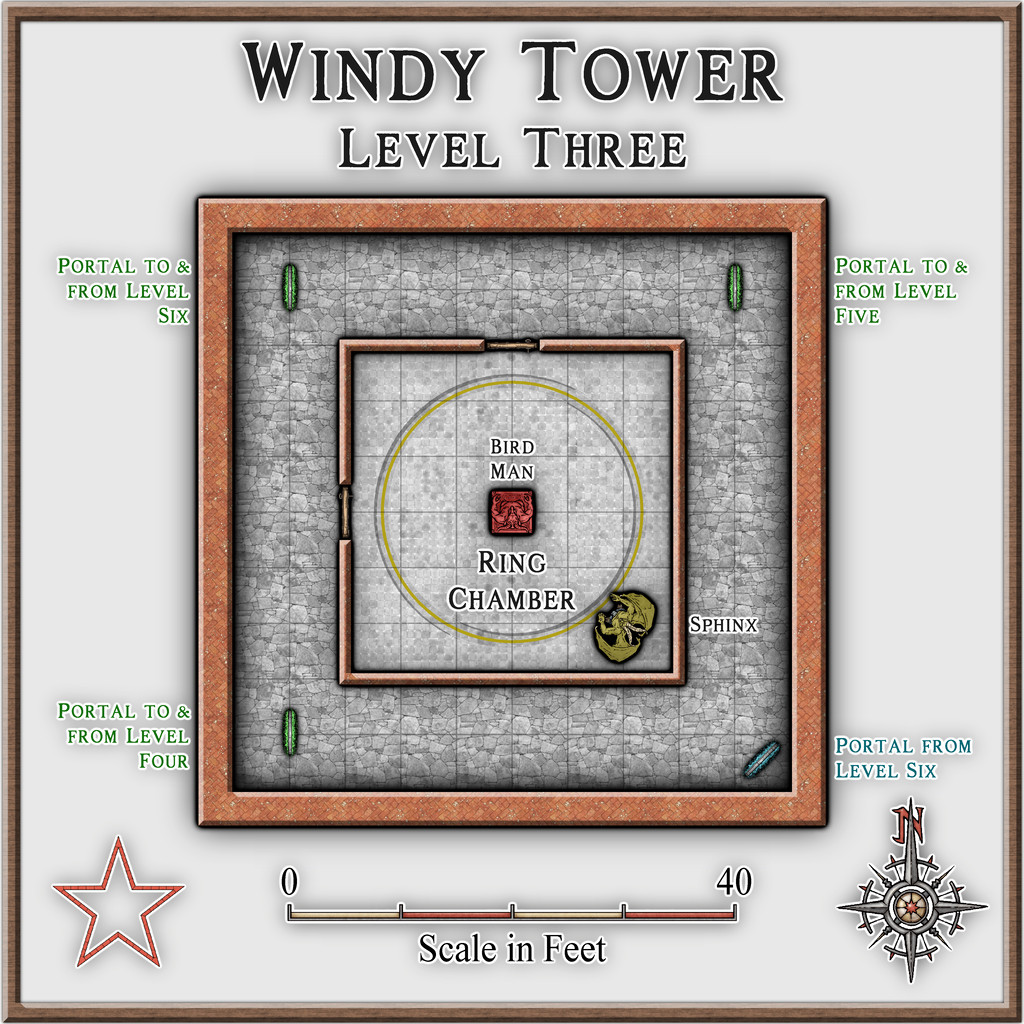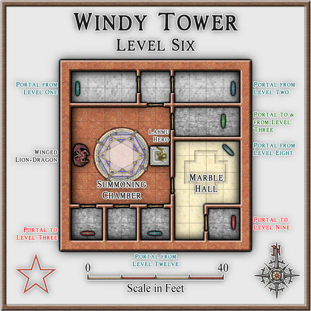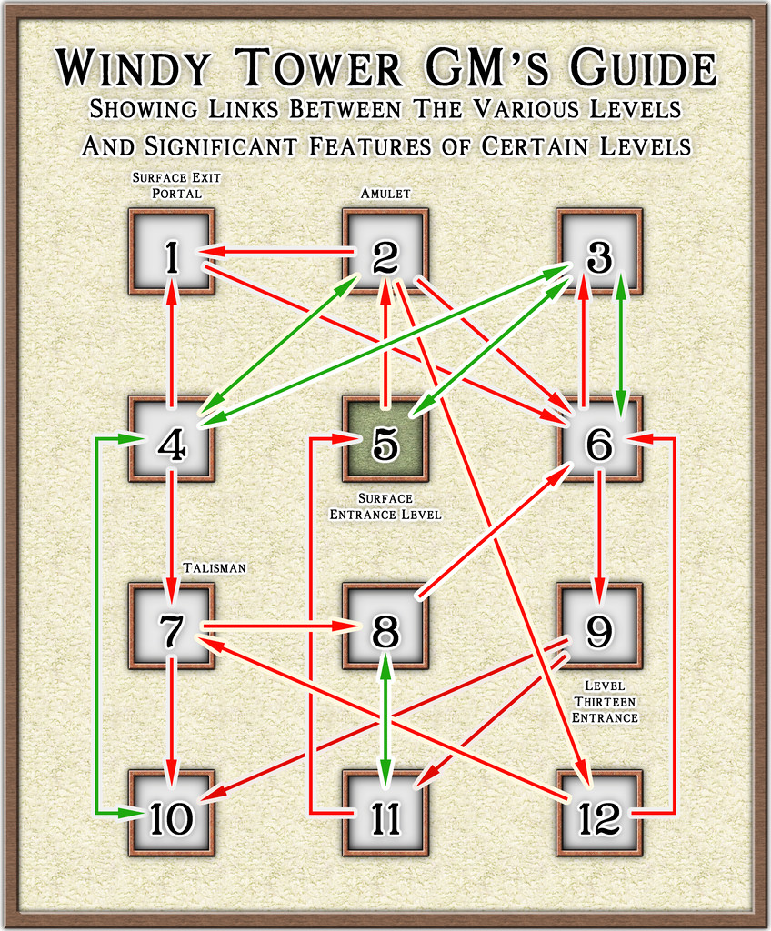 As I was drawing the various Tower levels, and especially when setting-up the cross-level hyperlinks, it soon became obvious I was relying on my own hand-scrawled schematic showing how all the levels connected with one another to manage that. This suggested a further such properly mapped schematic might be helpful for GMs trying to run the Tower with the portals active in the sequence shown on the maps. Thus we also have the Windy Tower GM's Guide map: