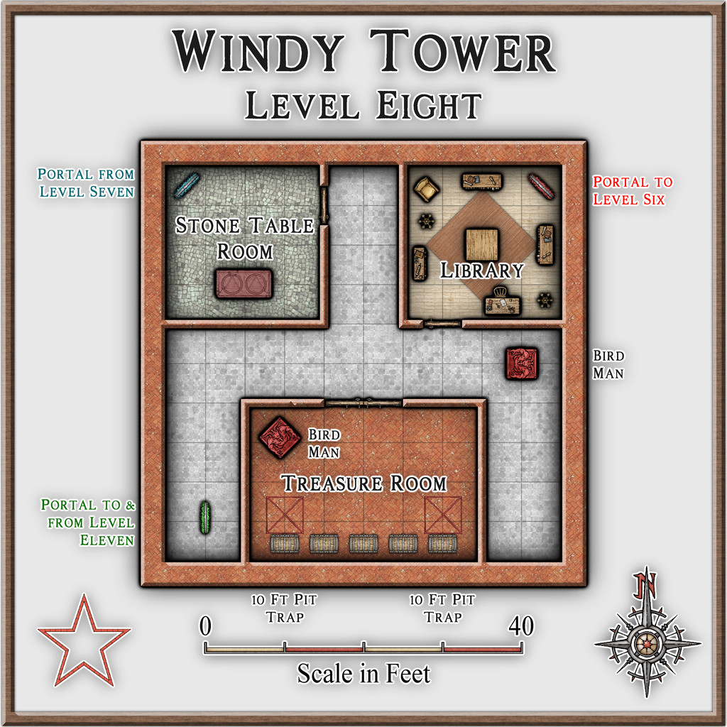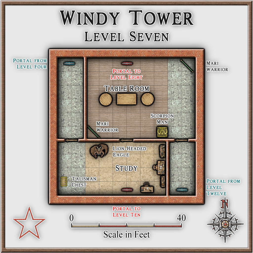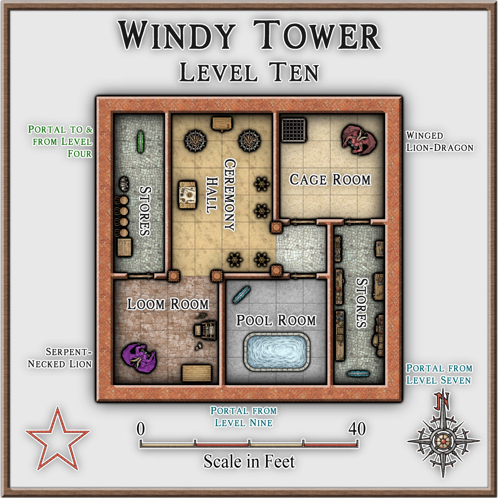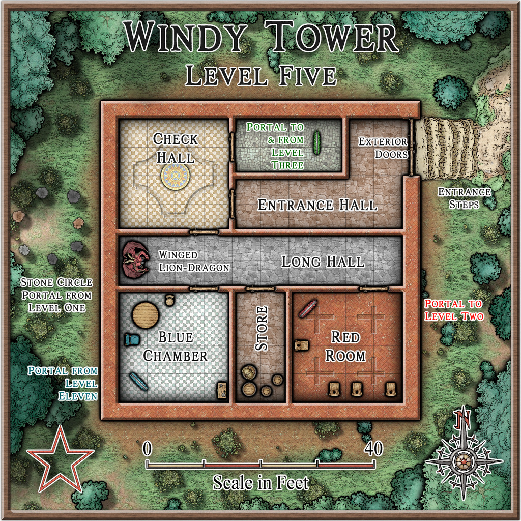 As I was drawing the various Tower levels, and especially when setting-up the cross-level hyperlinks, it soon became obvious I was relying on my own hand-scrawled schematic showing how all the levels connected with one another to manage that. This suggested a further such properly mapped schematic might be helpful for GMs trying to run the Tower with the portals active in the sequence shown on the maps. Thus we also have the Windy Tower GM's Guide map: