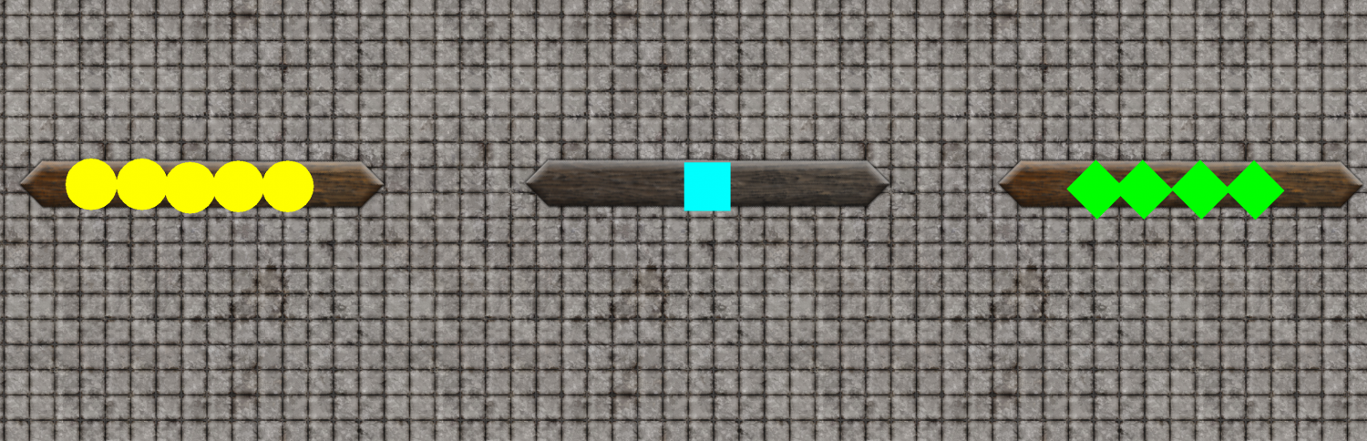 One significant problem was finding suitable markers for the different defending creatures per level. I'd already decided that these would appear as statues until activated by intruders in their part of their own level, so their starting locations needed to be identified. However, the range of top-down statues and creatures in the Mike Schley style - even with all the monthly symbol options - is extremely limited, especially as some of the statues have large bases as well. Adding the original DD3 creature options only helps marginally, again thanks to a limited range of options, most of which don't include varicolor that will allow creatures to appear as statues instead. So the creature options used here were purely a compromise, using varicolor shading at times to separate the different kinds, and occasionally adjusting the sizing as well for the larger non-humans.