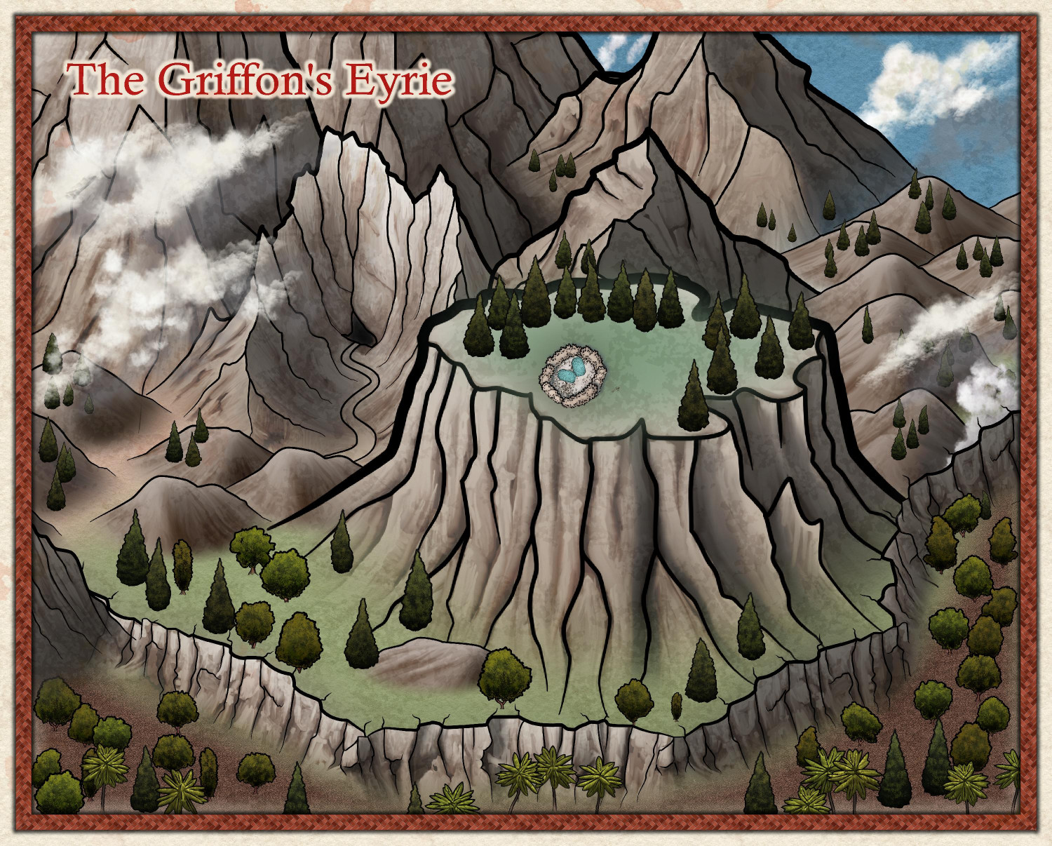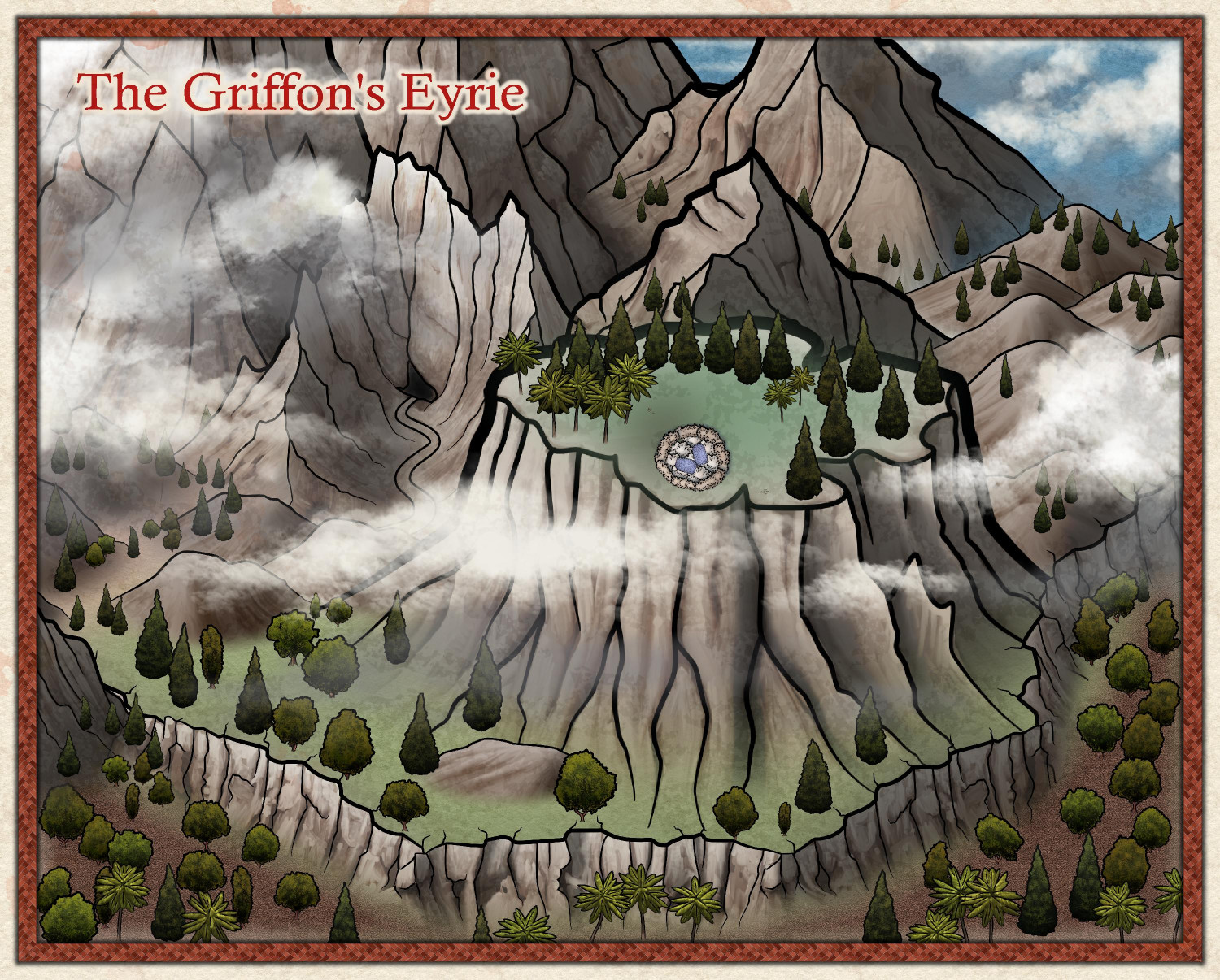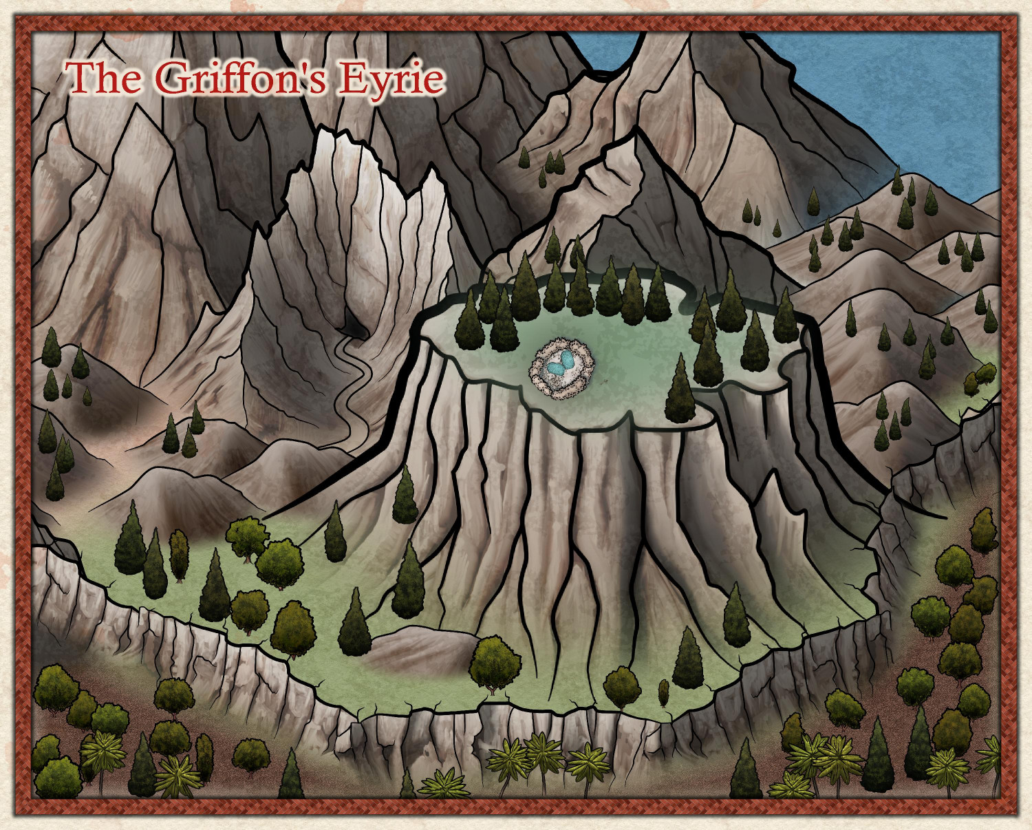 I've been working on a larger dungeon map, but to take a little break, I decided to do an adventure map, a griffon's nest. I wanted it to be sort of isometric using an overland style, and ended up choosing a style I haven't worked with much before: Darkland Overland. I struggled with the nest and ended up turning to SS6, Mike Schley's isometric city style, using some varicolor hedges and hay bales (with some SS4 dragon eggs thrown in).