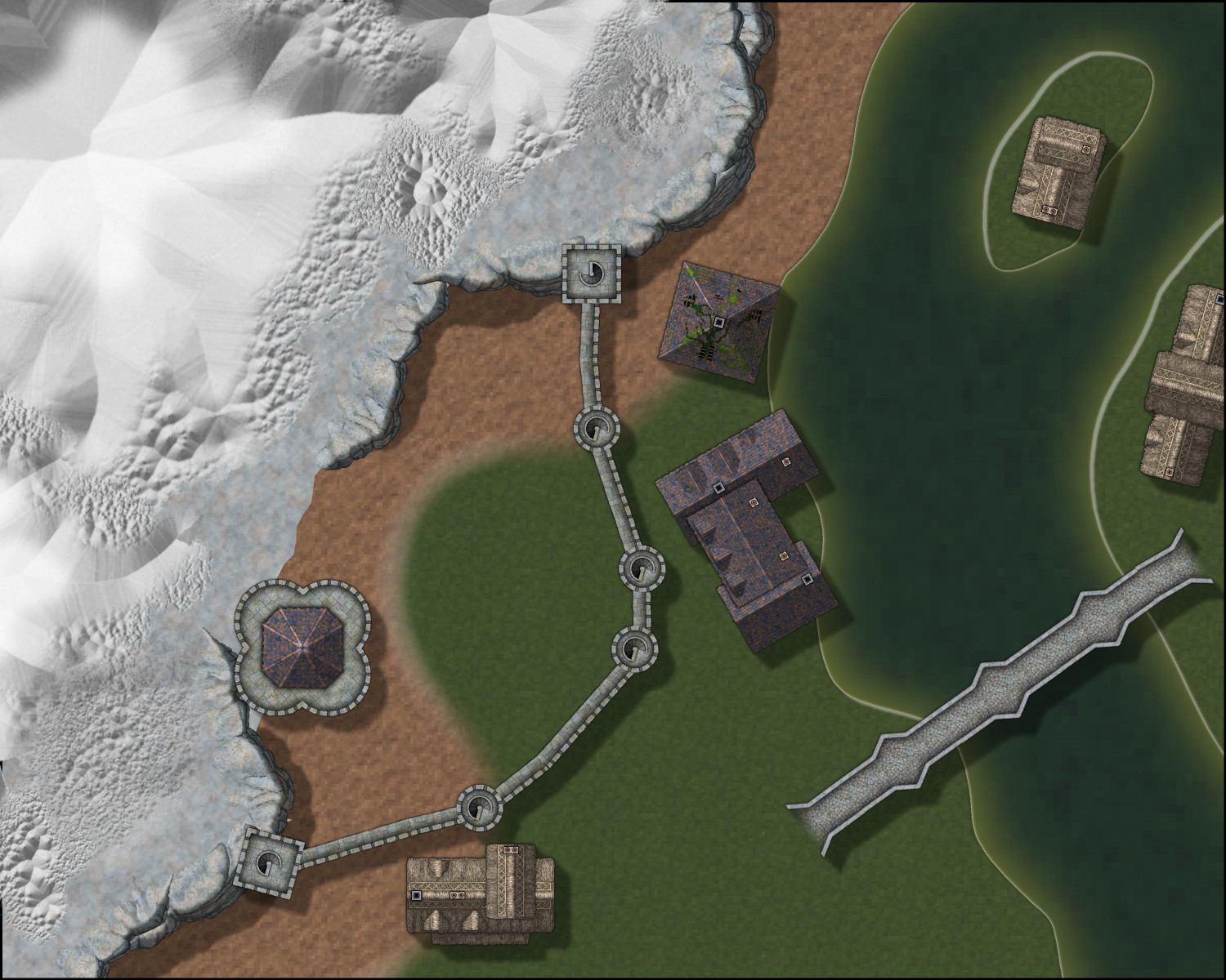 Here's a super quick, super rough experiment using Darklands City as the base with 13th Age Revisited for mountain peaks. I will keep playing with it, but there's some potential there.
