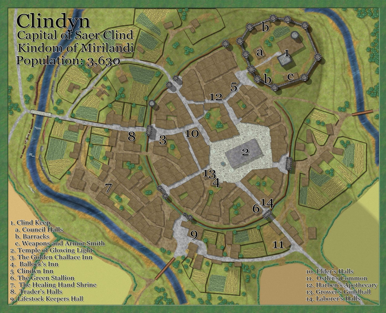 Clindyn is the Saer (Province) capital of the Clind Province in Mirilandi. It is near the confluence of two small rivers.