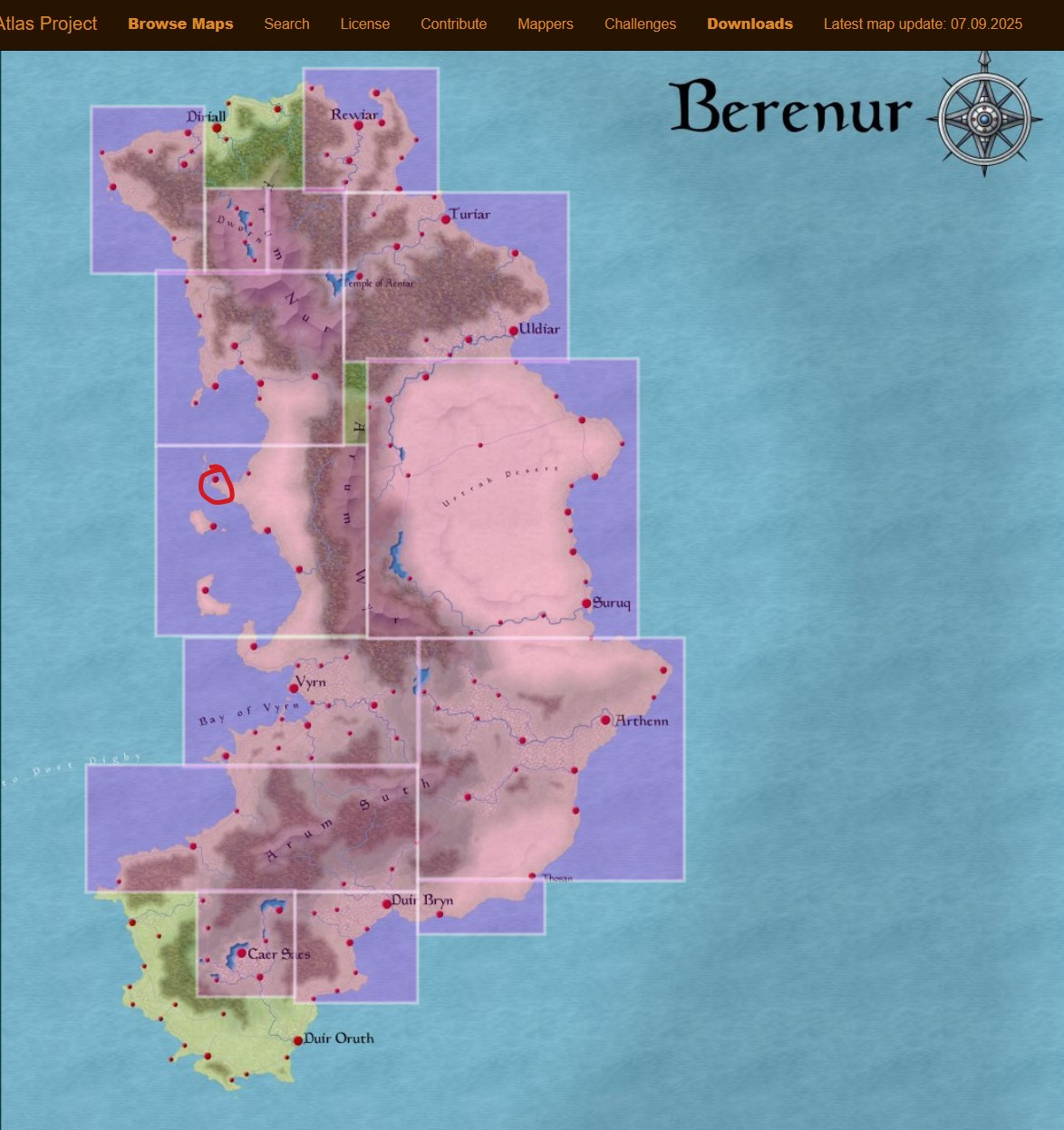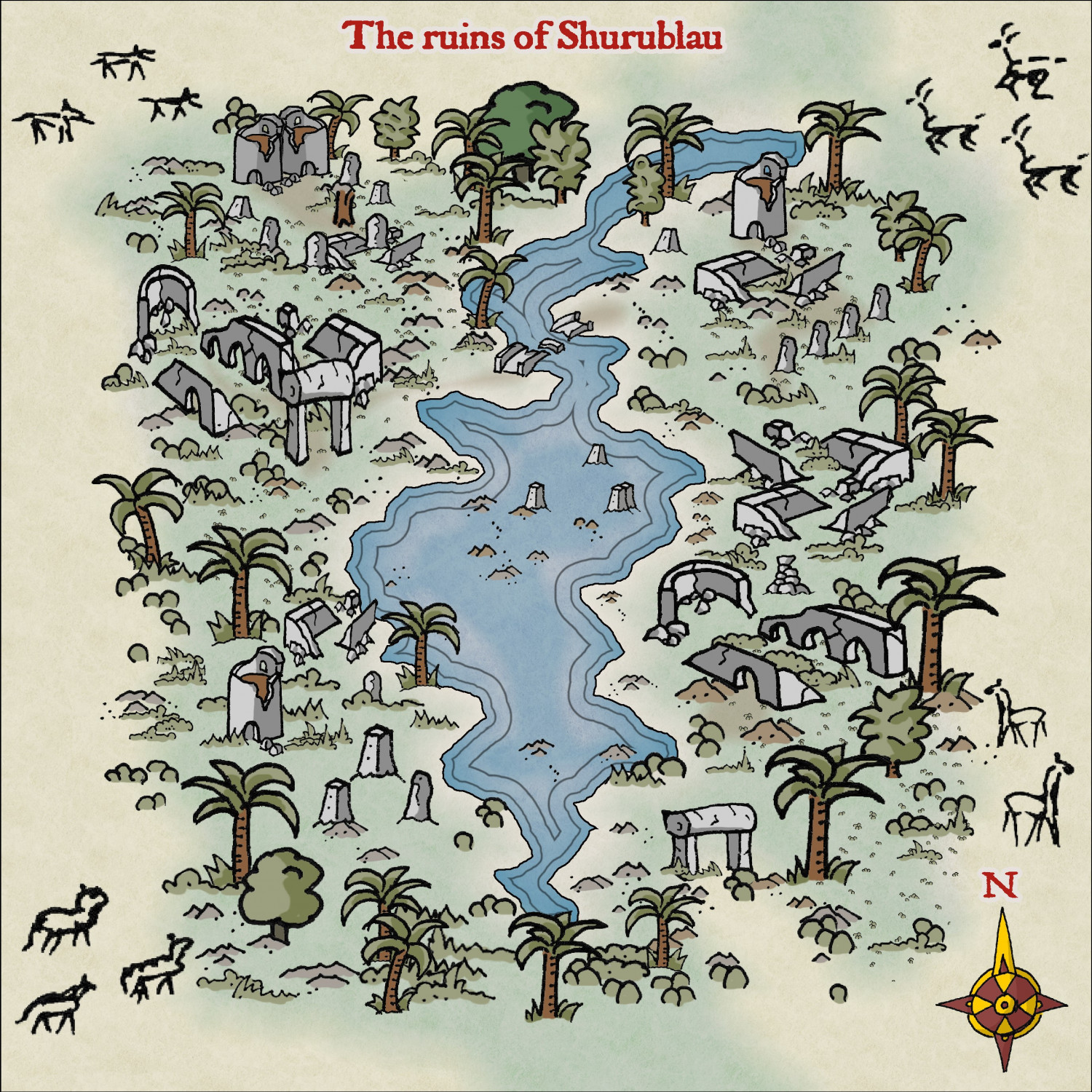 Last night I made a small map of ruins and began to unpretentiously create their history. I then decided to include it in our atlas and began wandering the world, looking for an arid place to place the buildings; the small lake gives it an oasis-like feel amidst the barrenness.