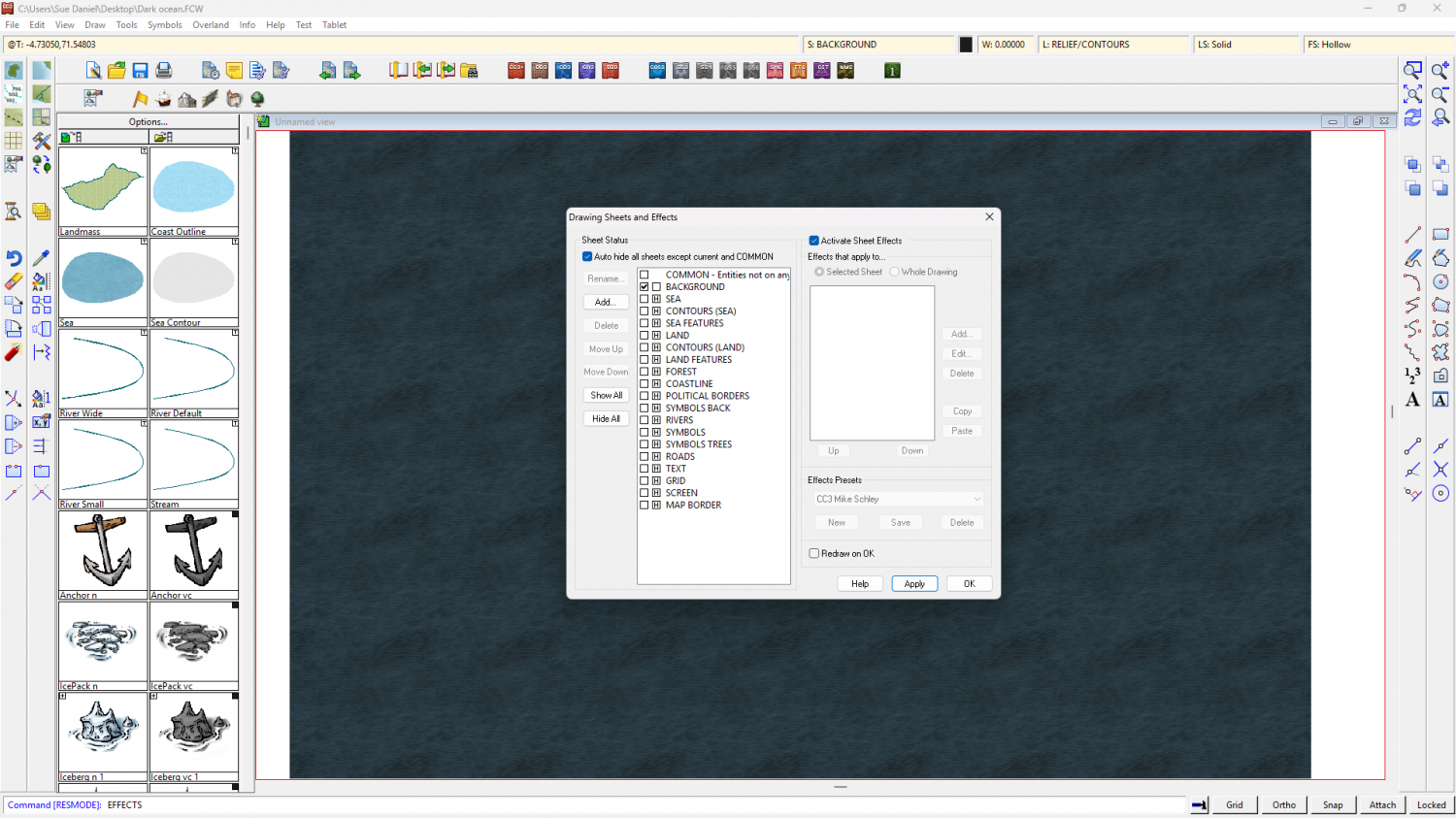 I don't mind using zig-zag lines and polygons for coasts, rivers, and railroads, but would like the option to replace them with other styles, e.g. to allow black-and-white printing. I can't figure out how to convert what I've drawn. I can't figure out how to replace what I've drawn either, either. Most of the existing styles are curves or fractals instead of straight paths, so they don't go where I've drawn them.