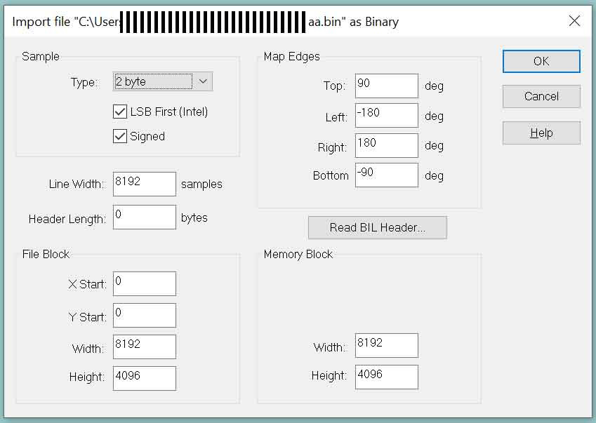 There is also a "Special MDR File" file type that's the same as above except for pixels are 32-bit floating point and there's a 1KB header at the top. This format is different from the "Wilbur MDR File" in that the "Special MDR File" is always whole-world Plate Caree, while "Wilbur MDR File" is the currently shown area for the map view, including projection, scaling, and any non-map data.