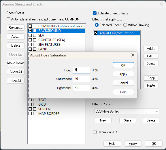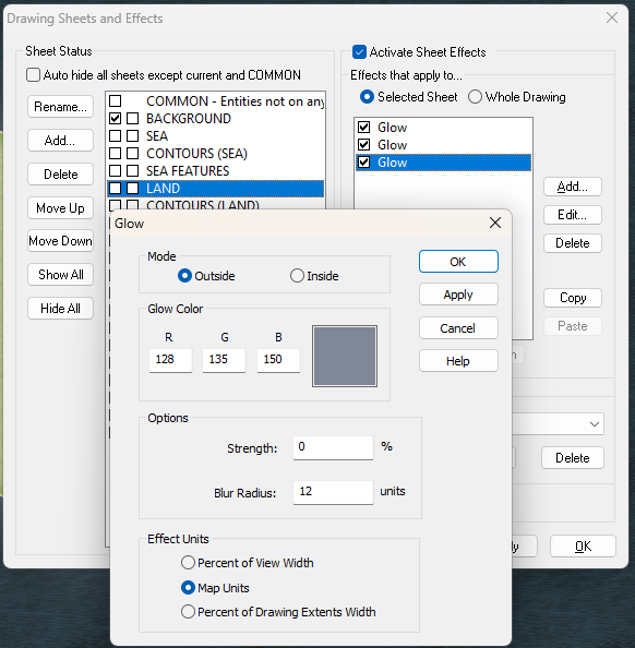 I hid the COASTLINE sheet and added effects to the BACKGROUND sheet and the LAND sheet. I haven't deleted any existing effects.