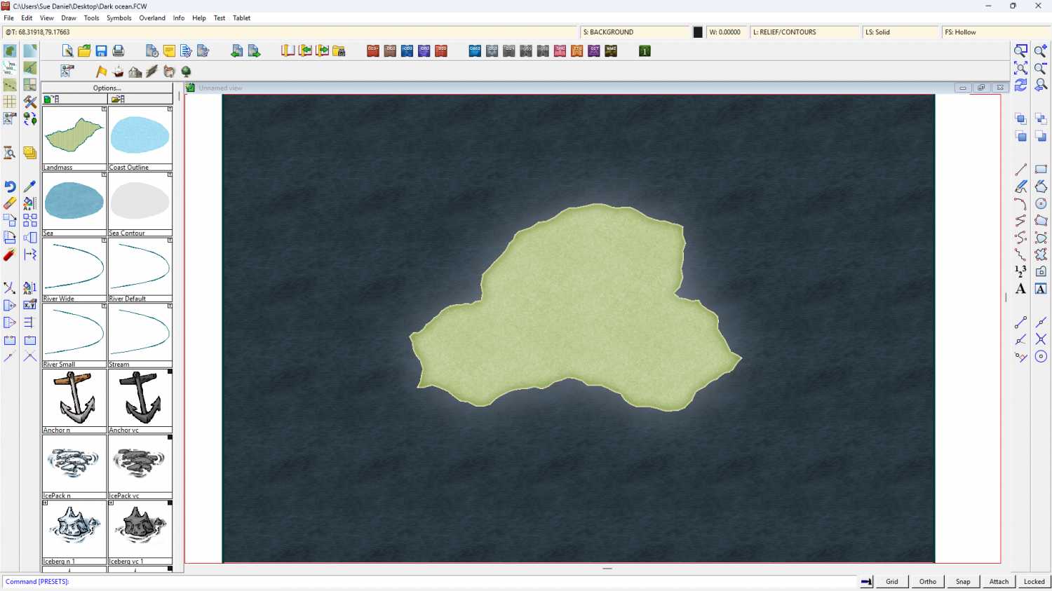 Currently drawing out a map using the Mike Schley Overland set. Below are two images displaying the sea colour/bitmap. I am trying to change from the Mike Schley colours for the sea to the colours represented in the second image. Greatly appreciated if anyone can help or point me in the right direction. I notice Sea is actually on the Background sheet for Mike Schley. I do not have a bitmap of my own and am happy with the Mike Schley one but just want darker moodier colours.