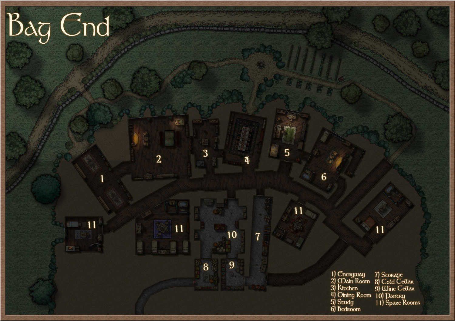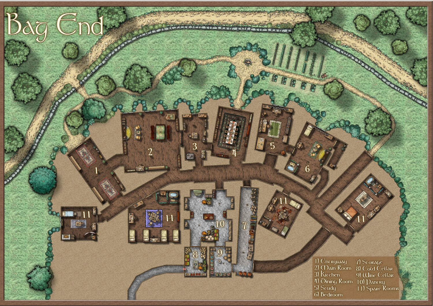 Running my first One Ring 2e campaign and needed a map of Bag End. So I started working on one (my first map in over a year). Having to dust the cobwebs off the old brain but think I'm making progress with the map. Still need to finish the interior sections some more, add the labels and the lighting. I'm also working on covering the interior with Bag End hill to see if I can make it look like a hill.