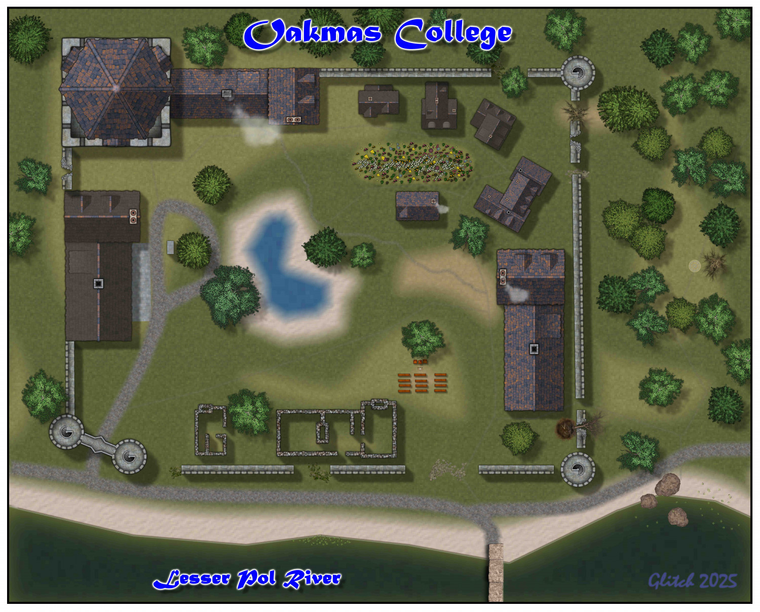 Located on the banks of the Lesser Pol River in Liosach; Oakmass College is built on the remains of an old river fort. The Great Tower has been remodeled and now serves as a Library and Grand Lecture Hall.