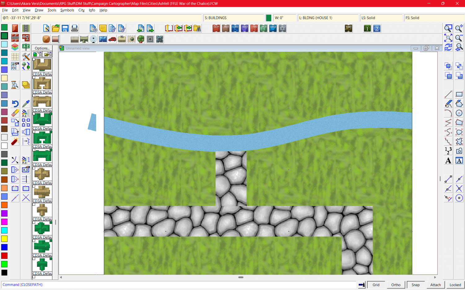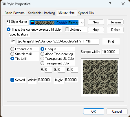 Click the box in the Status Bar (along the top) where you can see FS:..., and pick the Bitmap Fills tab, and the Cobble Bitmap from the Fill Style Name: dropdown.