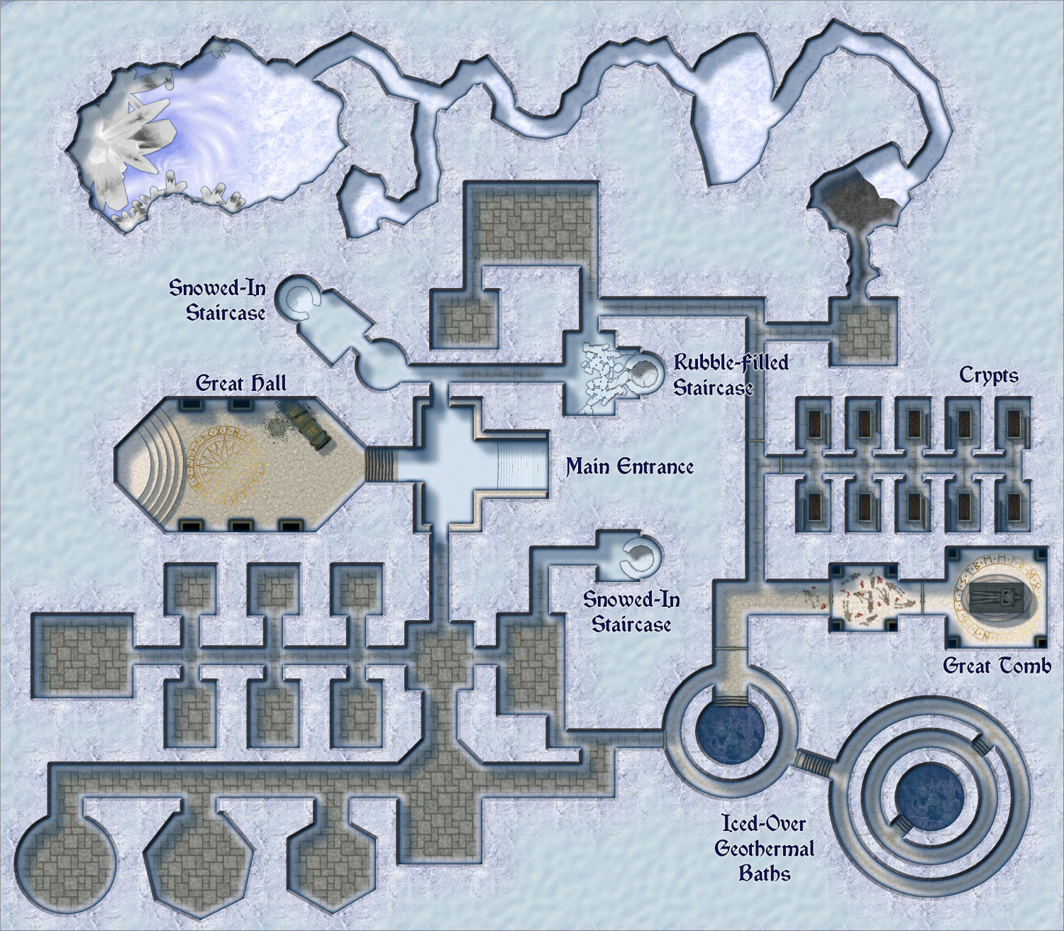 But cold weather is on my mind, and it inspired me to create ruins with the Ice Cave annual. This is the ruins of a dwarven temple that has been overcome by the weather, perhaps magically conjured. (Elsa, are you there?) All of the entrance staircases have been snowed-in. Although the rest of the temple remains snow-free, the walls have turned to ice, and icy frost creeps along the floor from the edges of the walls. Even the geothermal baths in the southeast corner have turned to ice.