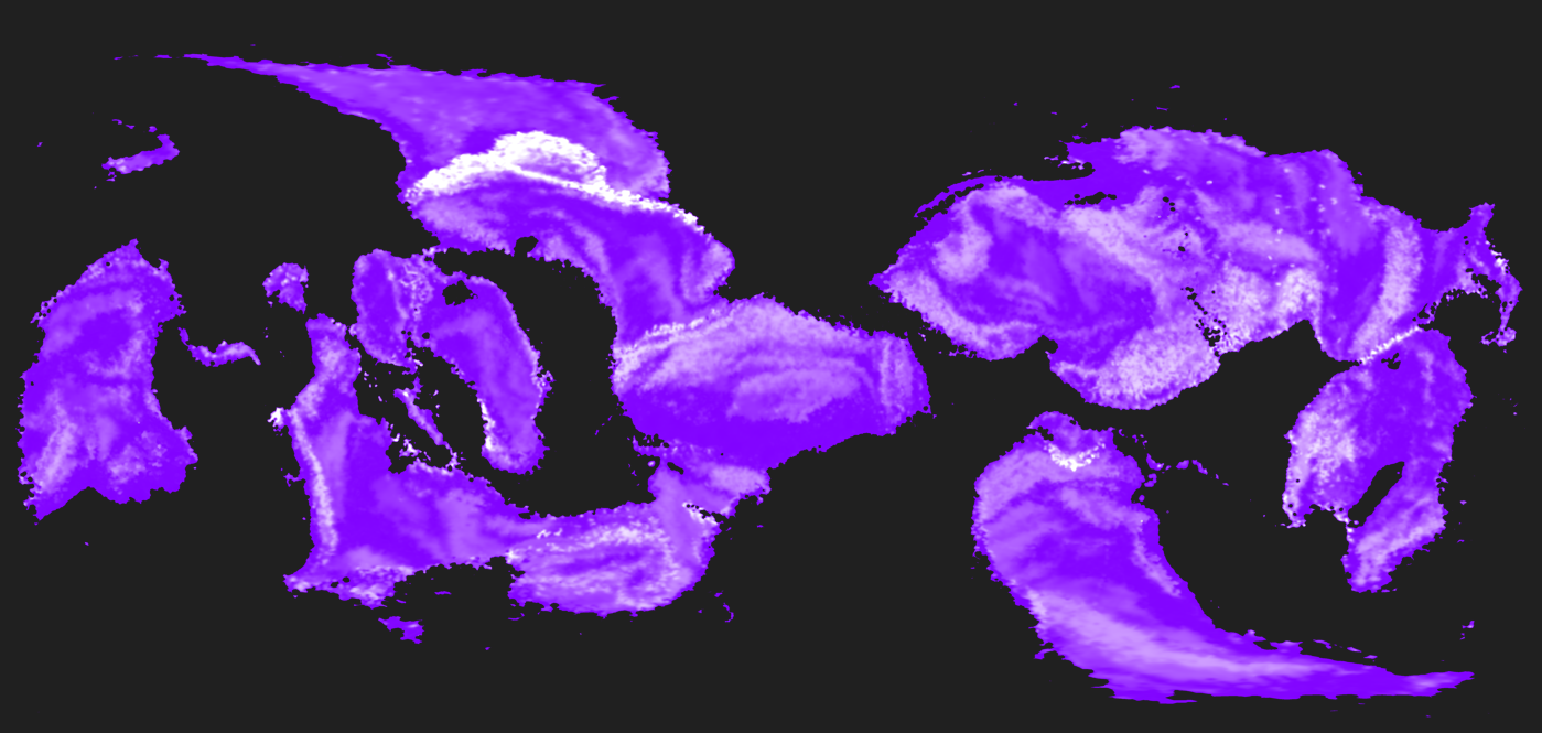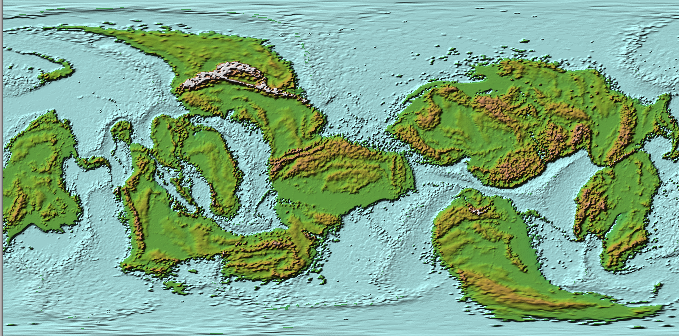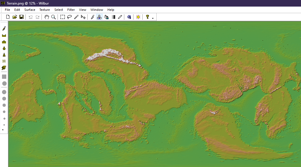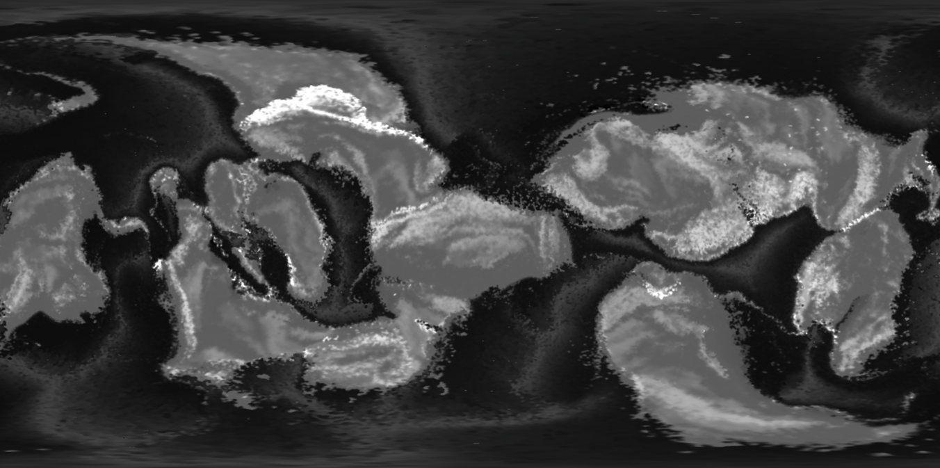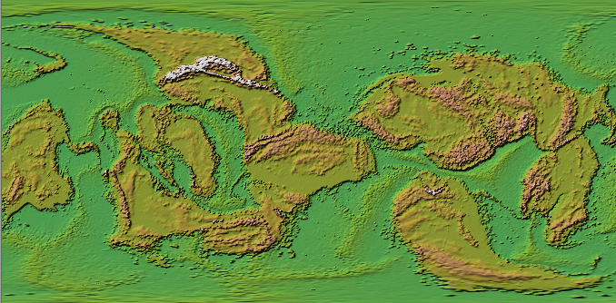 Although you can see from the colourful altitude view of Jerion (top) that there is a full 60,000 f00t range of altitudes from the -30,000ft bottom of the ocean right up to the top of the 30,000 ft tallest peak, the bump map (bottom) only shows the detail of the upper range of those heights. That's because we, as humans, can't tell the difference between shades of grey below about 60% black.