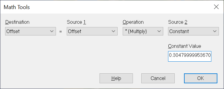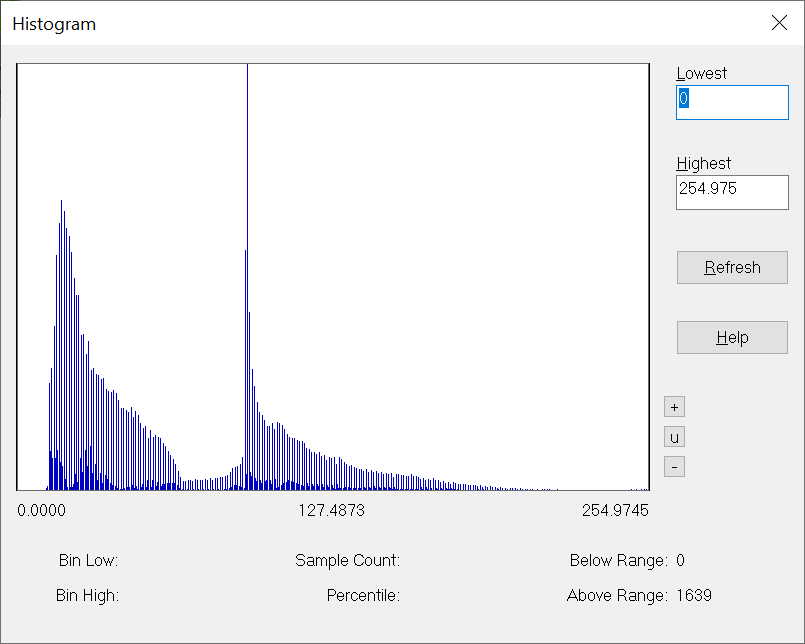 Window>>Histogram again shows low -64 and high 191 (as expected from a 0-255 grayscale image with a -64 offset). Assuming that we want the highest altitude at 9144 meters (30000 feet), we scale by 9144/191=47.87