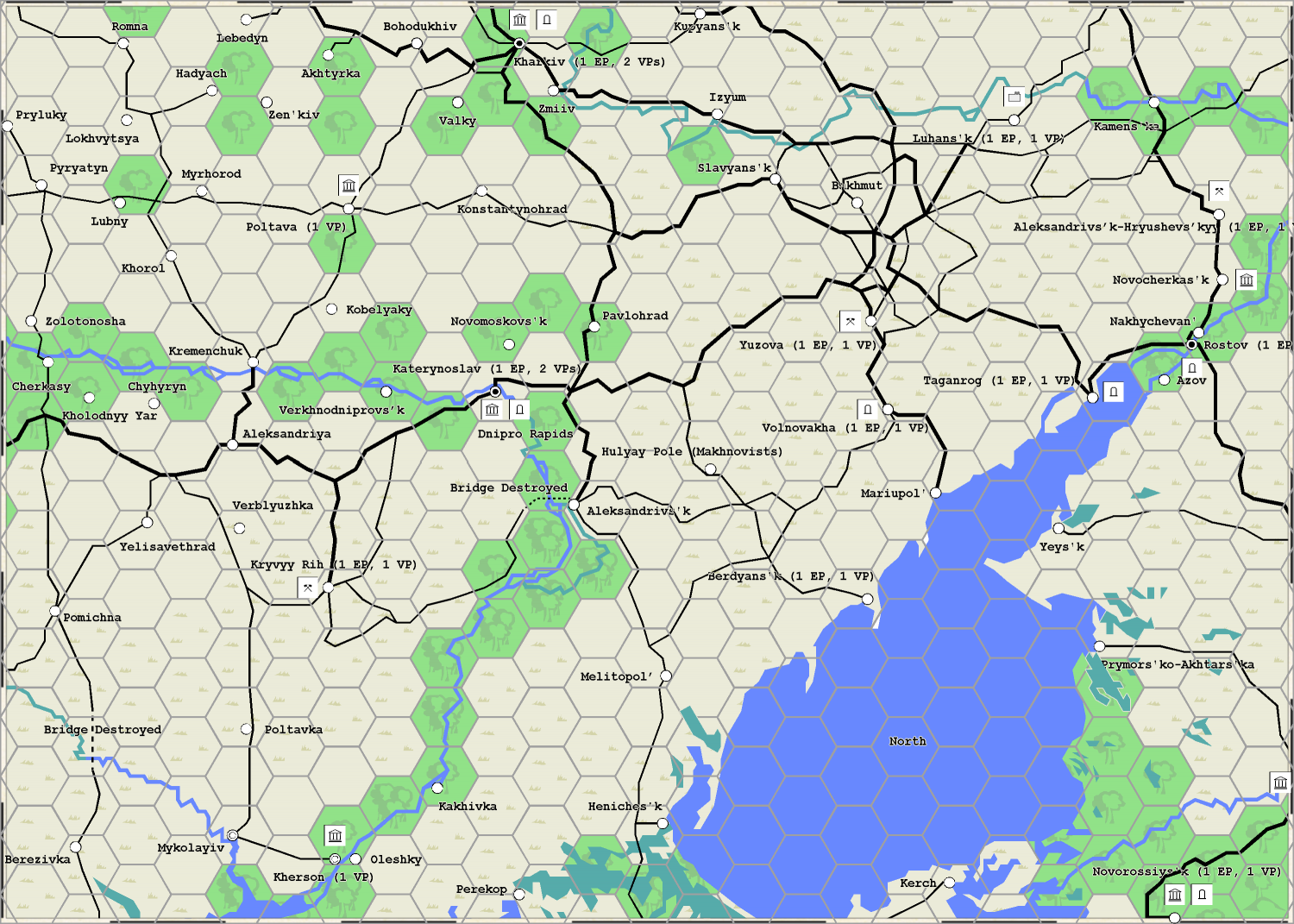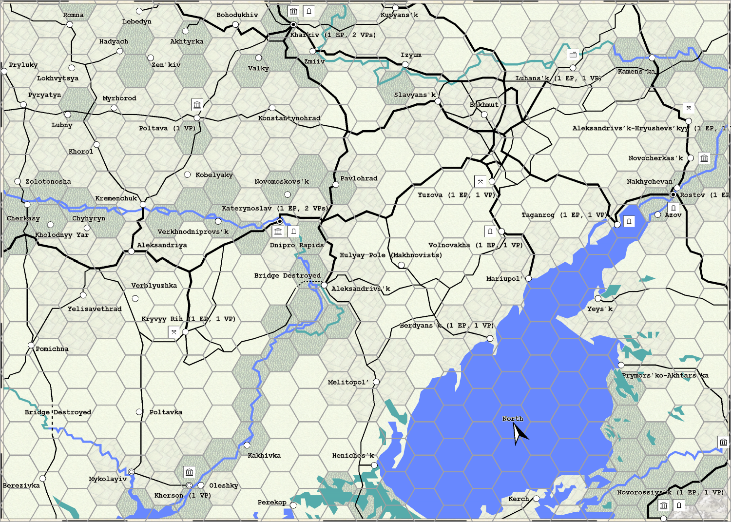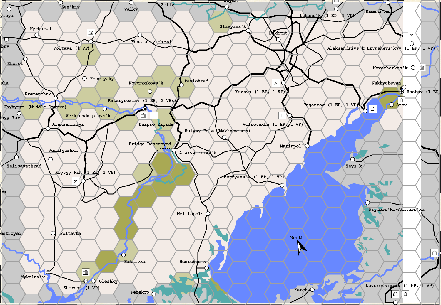 Since most of these sets have different symbols for plains and farmland, I might want to find a population density map and use these symbols to show that. But for game purposes, I should probably use the clearer symbol throughout. I tried some other hex symbols, but the scales weren't right.