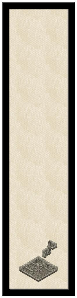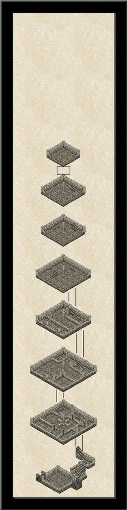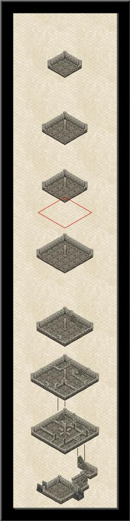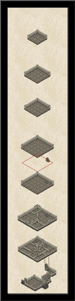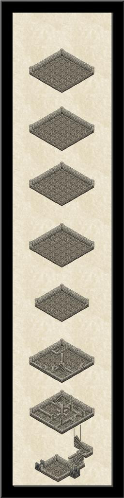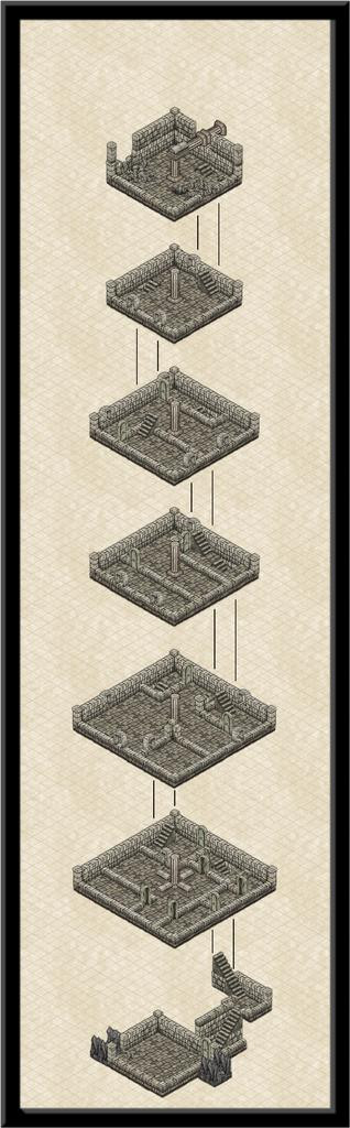 That small upper level has gone, replaced instead with a double-height level six one instead, where the pillar structure angles over to connect with the vanes on the outside. Token efforts to show part of the vanes using repurposed symbols or drawn lines came to nothing, unfortunately. The symbol orientations are too limited and with too few options to construct something suitable, and the available space meant the kind of sketchy lines possible never looked right. It had been a battle to get the ruined uppermost level to look reasonable as it was - again, the symbols available aren't designed for ruined exterior walls, so I just did what I could. There's also an unfortunate "tide-mark" because of the wall-colouring that darkens at the base, and which looks messy when stacked like this to give a double-height chamber.