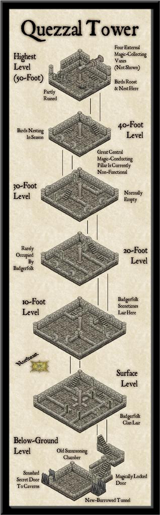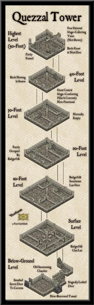 Let us draw a veil over such matters and move on another session or so, with the various Tower floors now sketched-in, just as a crude layout scheme: