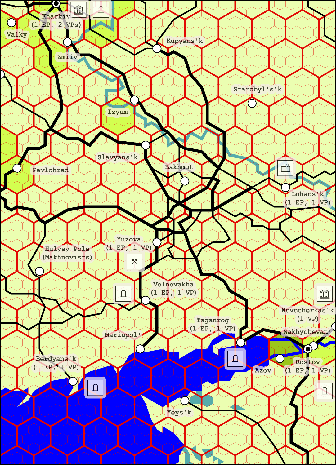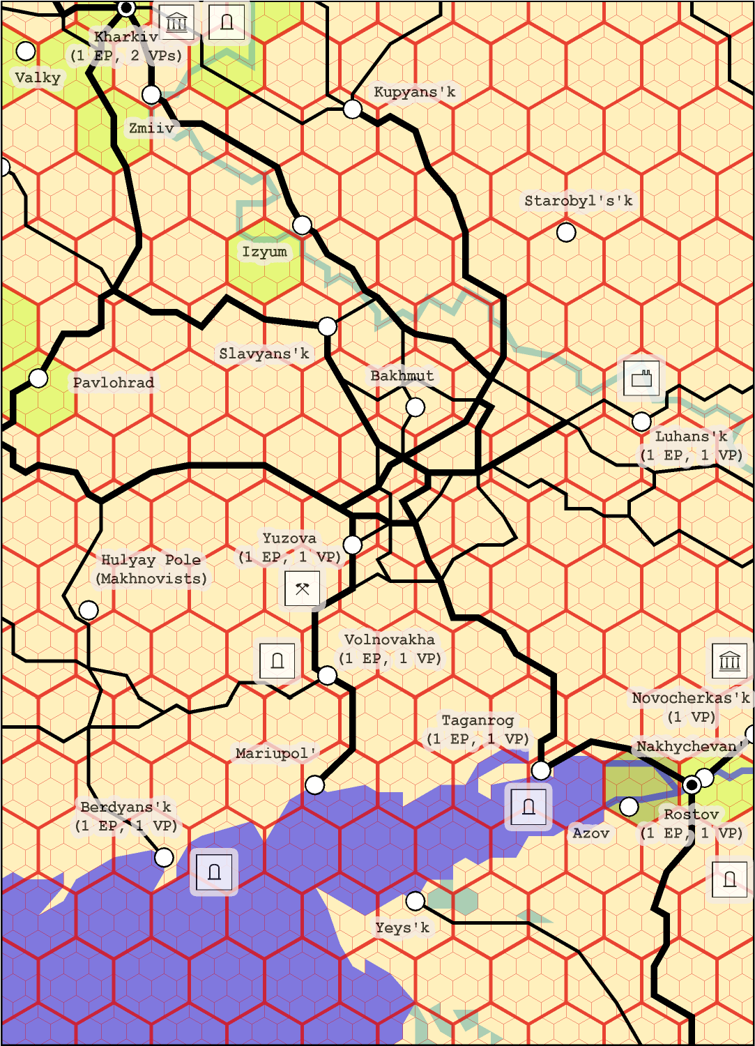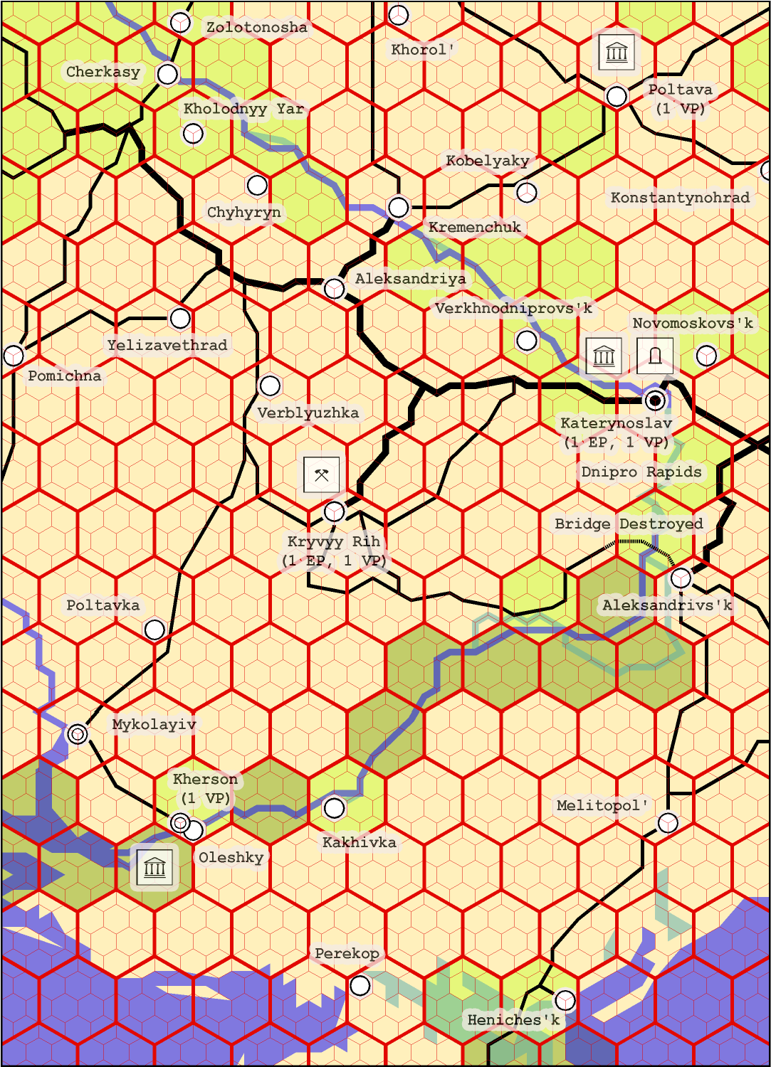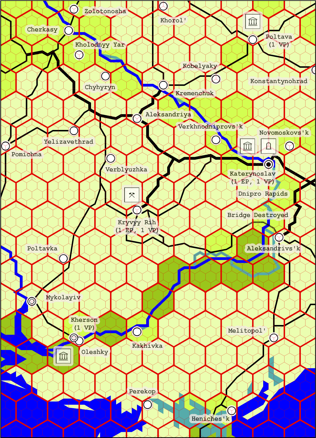 I went with 24-unit hexes, i.e, 32 units per inch, to simplify the math, and to allow reasonably-thin lines for hex grids, single-track railroads, etc. But somehow 1. the scale factor is off; if I pick 32 units per inch, it exports something around 8 units per inch, perhaps 32 per 10 cm, and 2. it insists on printing the extras around the edges.