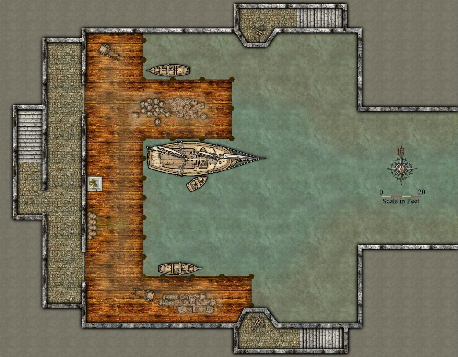 A hidden lair below an established Pilot's Guild hall where the spoils of privateers is accumulated, catataloged, and set for auction. The hidden defense is a water elemental.