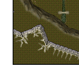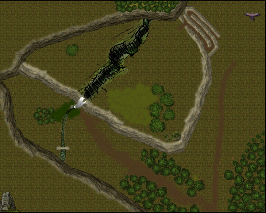 • Maybe this is the right crevice. Not sure which style i found it in now but searched for crevice in symbols. I filled it to a point with water. Added most and grass patch to cover up as much of the ends as I could though you can see that dark patch in the stream below. Tossed in a few more trees. Thinking bridge over the crevice and buildings are next. I would love to find some sort of building that is built into the back cliff face. Not so sure about the plateau peak in the bottom left does not seem to work with the style of the map, will probably replace it with more cliffs or banks.