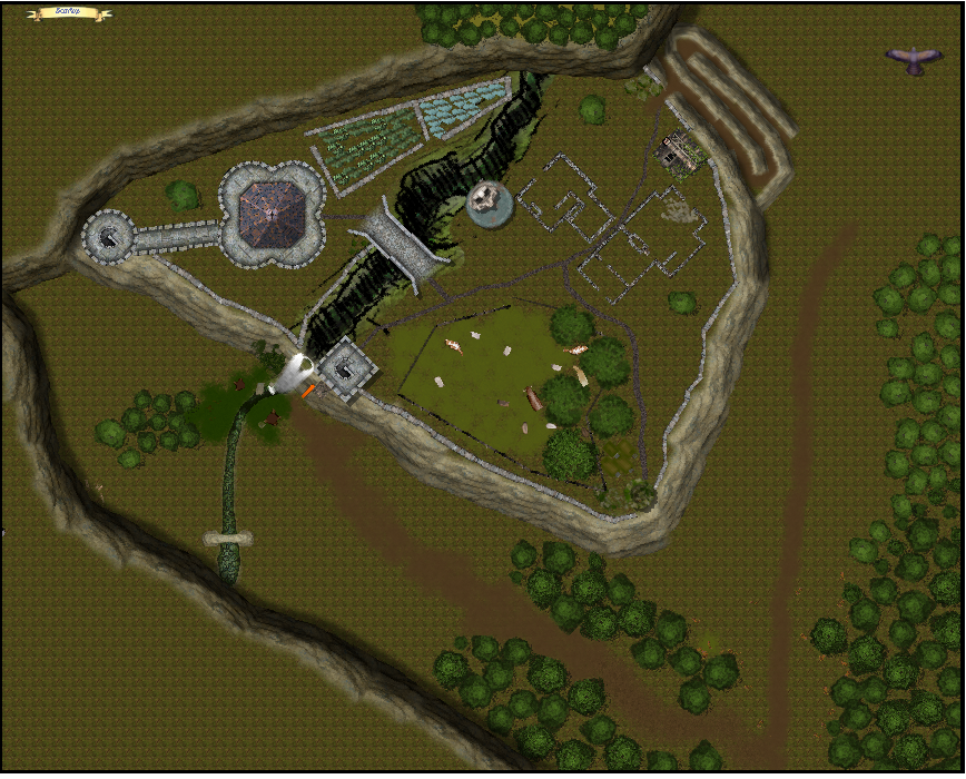 • So it is coming together. Not sure why the bridge looks the way it does.. when you zoom in it looks fine, I have tried repositioning them, several times. The towers and fortress I wish I could find a way to give them a more worn look. Maybe cover them with cliff shadow.. not sure. I still have a few things to do but the core is done. I may need to pause and work on interior floor plans since I might need them Saturday. Still need to figure out how to be able to add a cave entrance look on one of these cliffs and my little thatch roof near the orange arrow is suppose to be an elevator.. not sure if there is a crane like or pulley object I can use out there.