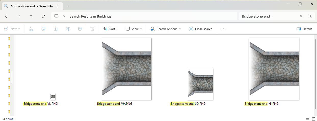 Very high resolution images are nice close up, but when you zoom out it's quite costly on redraw time. To make panning and zooming more efficient there are 4 different sizes or resolutions of each symbol available for CC to use (shown below). CC chooses whichever resolution is most appropriate for the zoom level that you are viewing the map at, which means that when you are zoomed out you could be looking at the lowest resolution of the four available and the bridge might be only 10 pixels wide in that moment. This means that a single pixel-worth of misalignment will appear to be 1/10 or so of the bridge width and quite noticeable - especially if they are arranged diagonally.