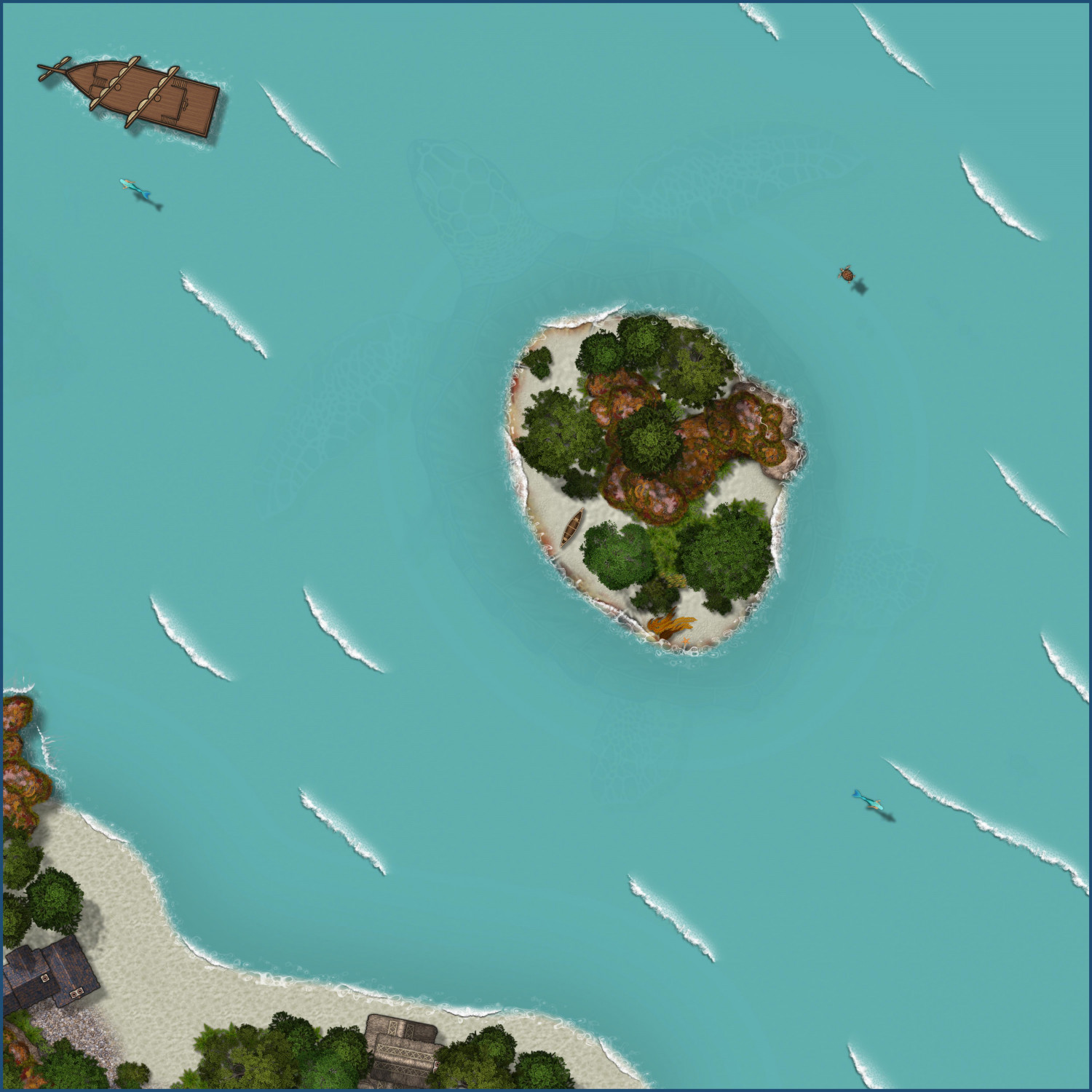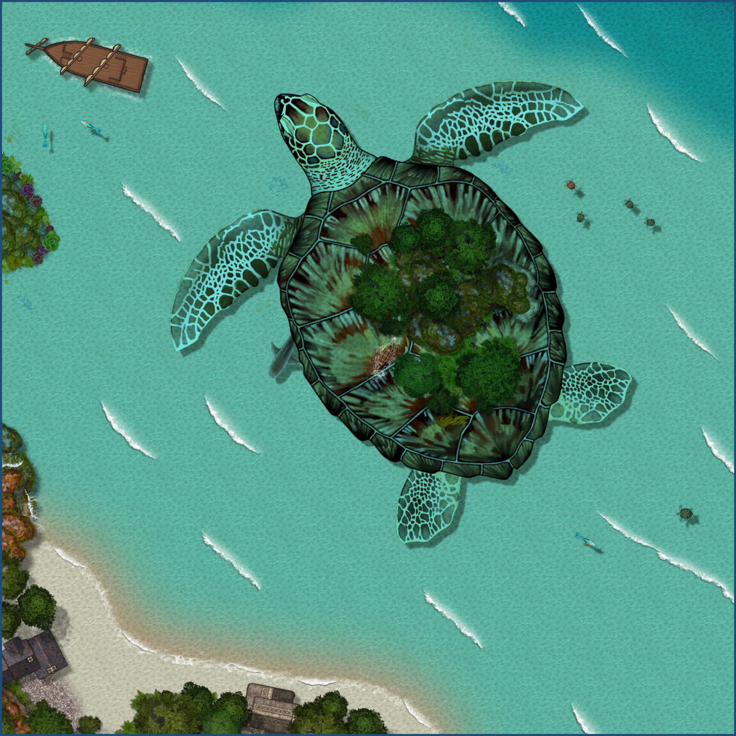 If the PCs disturb the Aspidochelone (by lighting a campfire, for example), here's a version where it has dived below the water, imperiling the party. The canoe floats, fortunately, so I left it above water and added ripples around it.