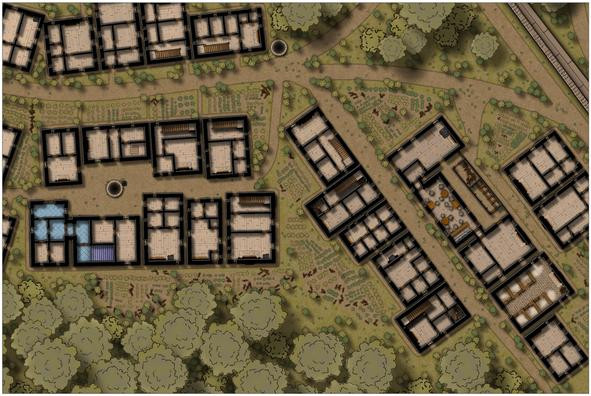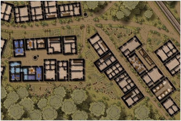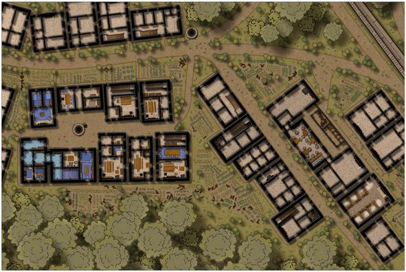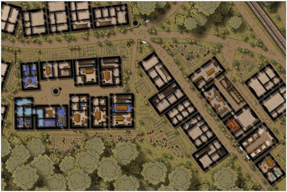 Meeting House is a bit different, with a library and a couple of somewhat higher-ranked cult leaders in separate rooms. As before, the structures not directly connected with the cult on the western map edge, are to be left unfurnished. The remaining three properties were not to be so left alone though, and this is the higher-res final version of this map: