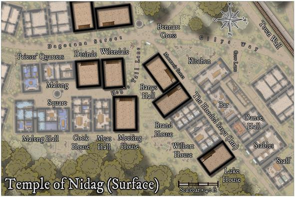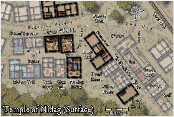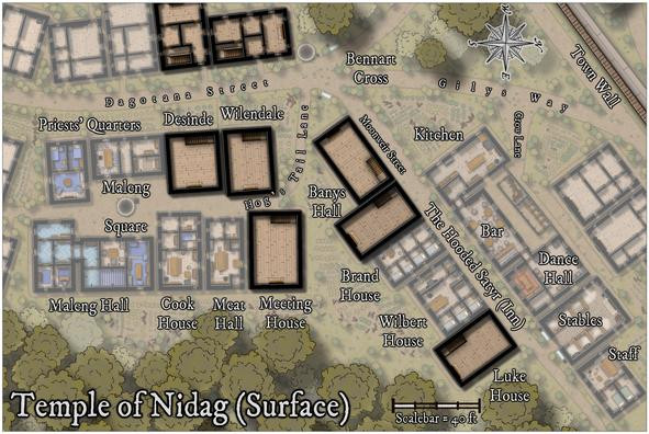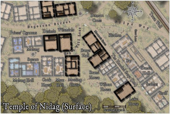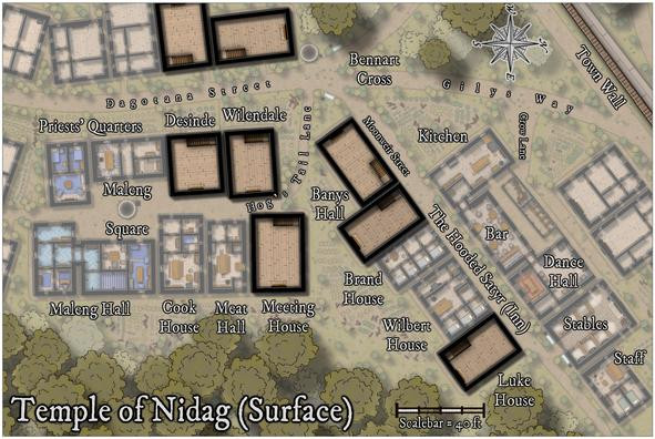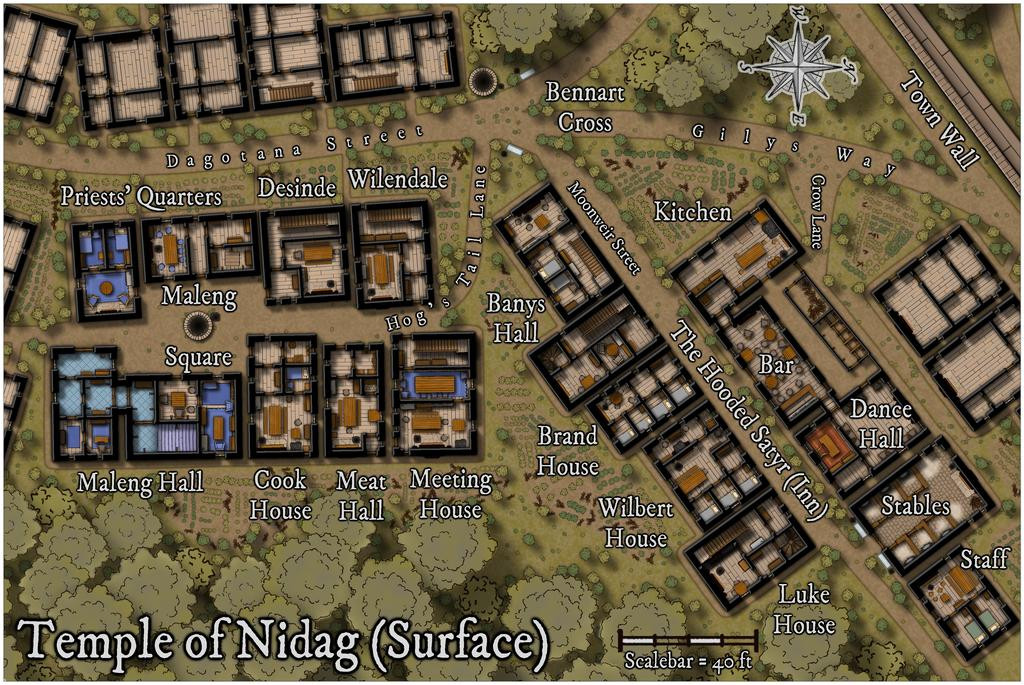 I did think of furnishing all the buildings, but felt that would draw attention too much away from the more central properties linked to the subterranean map. This does also leave open the possibility to install player-characters in one or other of these should they wish to spy on the temple and its congregation at some point. Plus it was common practice in many of the earliest D&D maps to show no roofs, just walls, stairs, doorways and windows, for surface buildings.