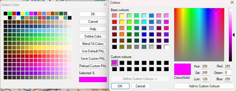 Open the palette (left below) and pick colour 6, then click Define Color. That opens the Color dialog. You will need to click on the magenta in the Custom colours block in that dialog to see the details on the right.