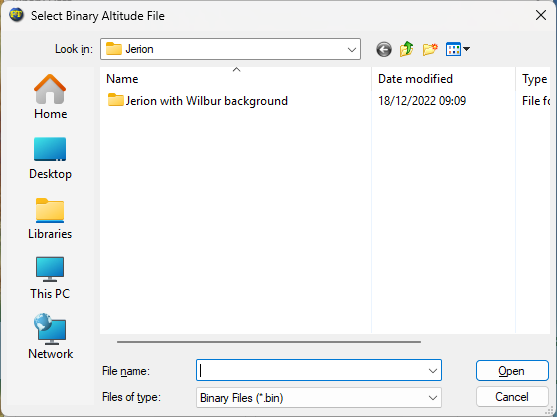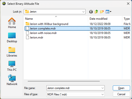 Remember to change the file type at the bottom of the Select Binary Altitude File dialog to MDR Files (*.mdr).