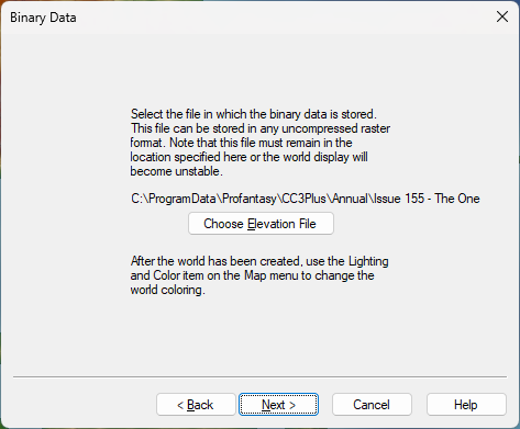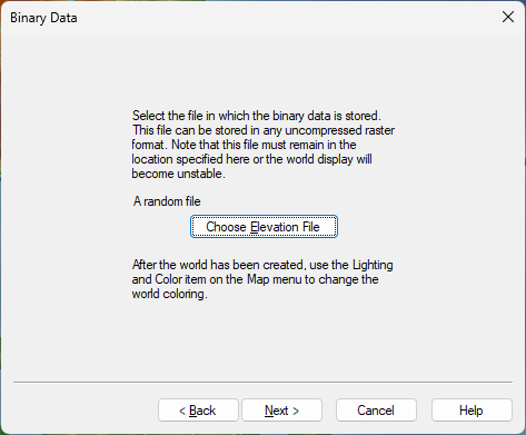 Because the filepath is an absolute reference, moving or deleting the MDR file will cause the FT3+ world to lose it's data source, so it is best to then burn the height data into the file using Burn In to Surface in the Tools>Actions submenu, then save the .ftw file. This will prevent the data going missing if you move or delete the source MDR file.